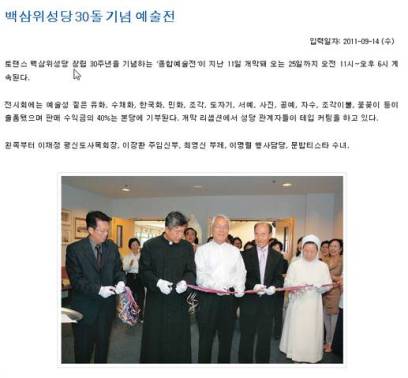 "백삼위성당 30돌 기념 예술전 입력일자: 2011-09-14 (수) 토랜스 백삼위성당 창립 30주년을 기념하는 ‘종합예술전’이 지난 11일 개막돼 오는 25일까지 오전 11시~오후 6시 계속된다. 전시회에는 예술성 짙은 유화, 수채화, 한국화, 민화, 조각, 도자기, 서예, 사진, 공예, 자수, 조각이불, 꽃꽂이 등이 출품됐으며 판매 수익금의 40%는 본당에 기부된다. 개막 리셉션에서 성당 관계자들이 테입 커팅을 하고 있다.