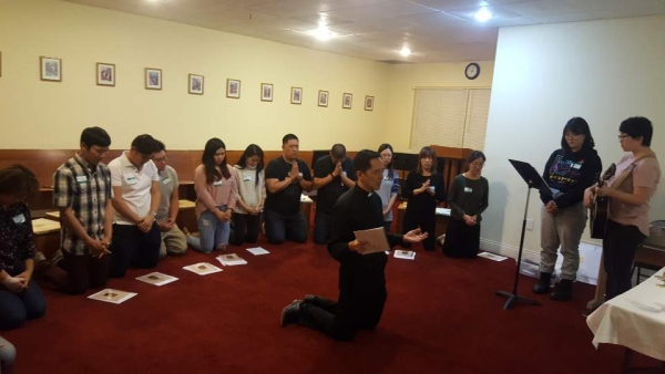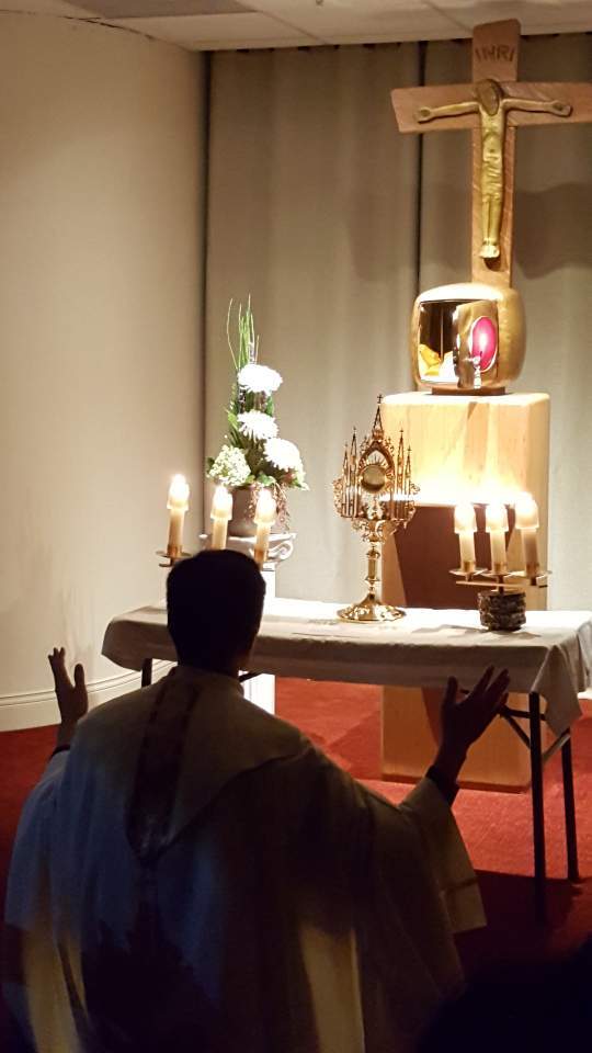 성체 조배실에 시작 기도, 찬양, 성체 현시, 안수, 그리고 기념 촬영 모습입니다.