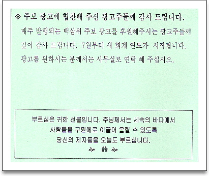 [주요행사] [주보] 광고 2017 페이지 정보 작성자 : 홈피관리 작성일 : 2017-06-24 조회수 : 1,647 목록 본문 홈피 관리위원회 103skcc@gmail.com 이전글[20170625] 연중 제 12주일입니다. 17.07.01 다음글[20170618] 한글학교 종업식사진입니다.(2 of 2) 17.06.23 LIST