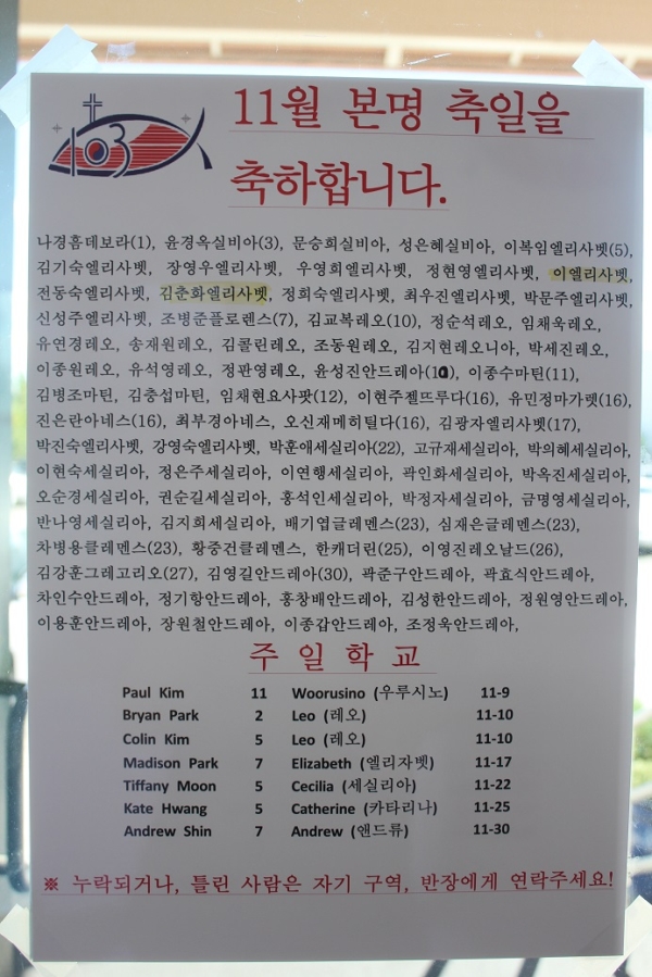 [주요행사] 11월 본명 축일을 축하합니다. 페이지 정보 작성자 : 박 프란시스코 작성일 : 2014-11-02 조회수 : 1,605 목록 본문 11월 본명 축일을 축하합니다. 이전글103위 순교성인 전시 14.11.02 다음글2014년 안나회 온천관광 14.10.28 LIST