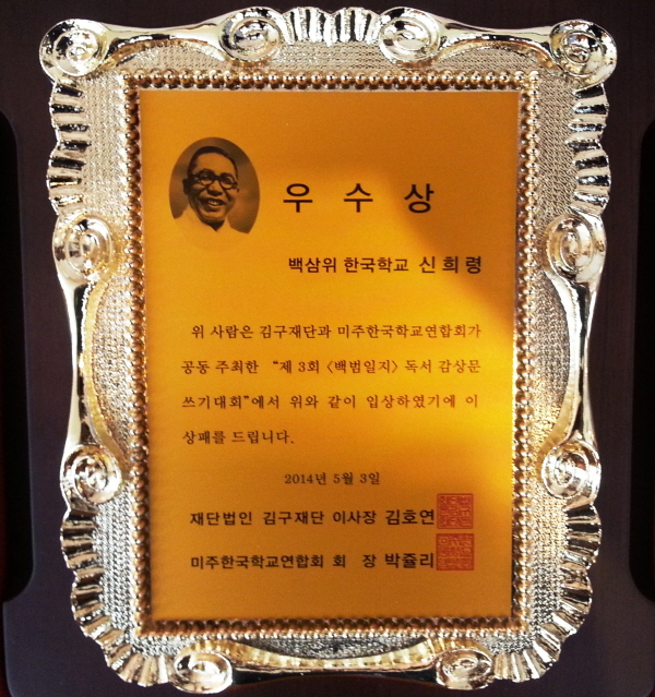 "제 3회 <백범일지> 독서 감상문 쓰기대회" 에서 백삼위 한국학교의 신희령 Alicia 자매님이 우수상을 수상하였습니다.